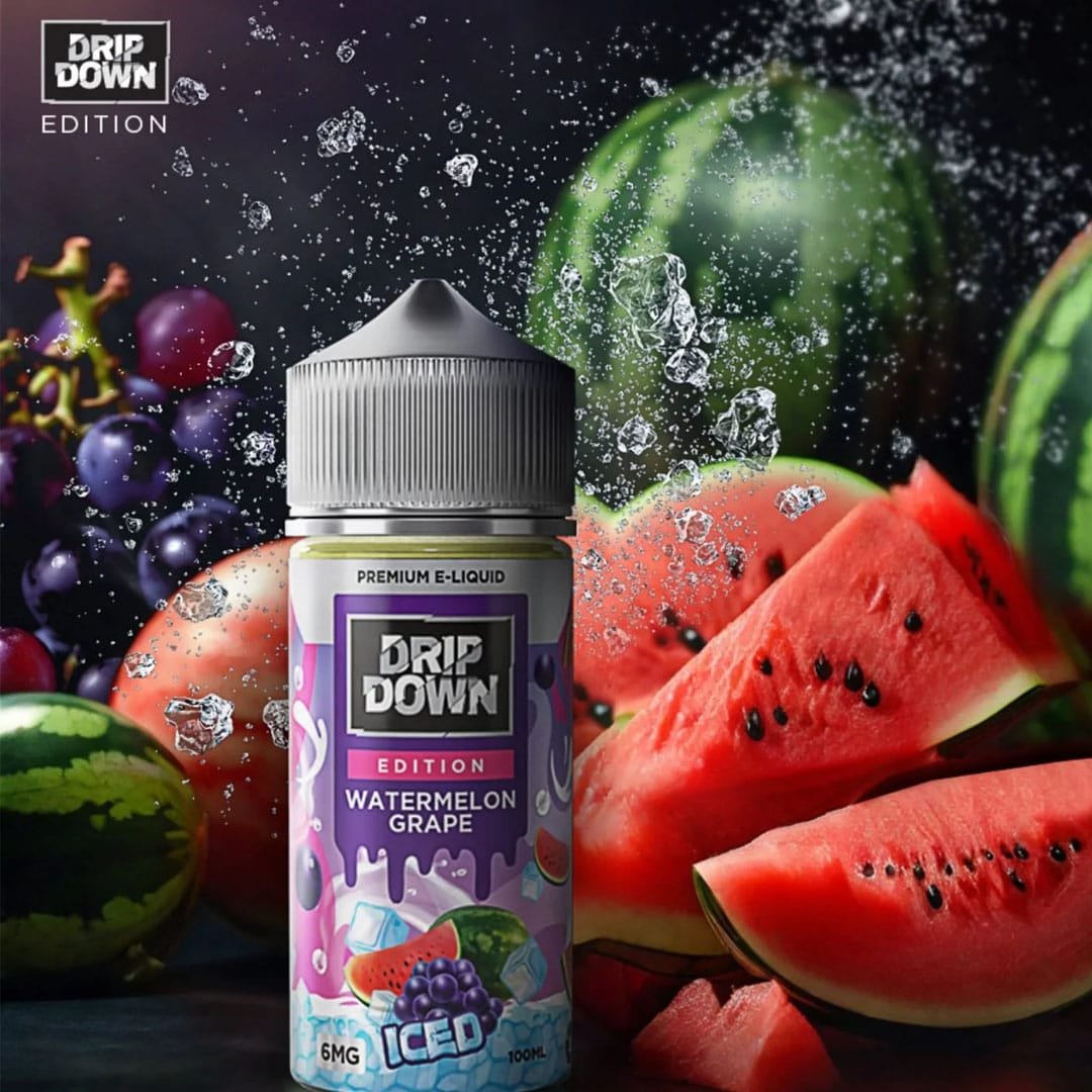 Improve your vaping experience with the captivating blend of watermelon grape iced e-liquid that promises a symphony of flavors, with a delightful icy kick.DRIP DOWN Watermelon Grape ICED, available in both 25mg and 50mg nicotine strengths. This flavorful e-liquid brings together the refreshing flavors of juicy watermelon, juicy grapes, and a chilling icy twist, all expertly blended for an exhilarating vaping experience.